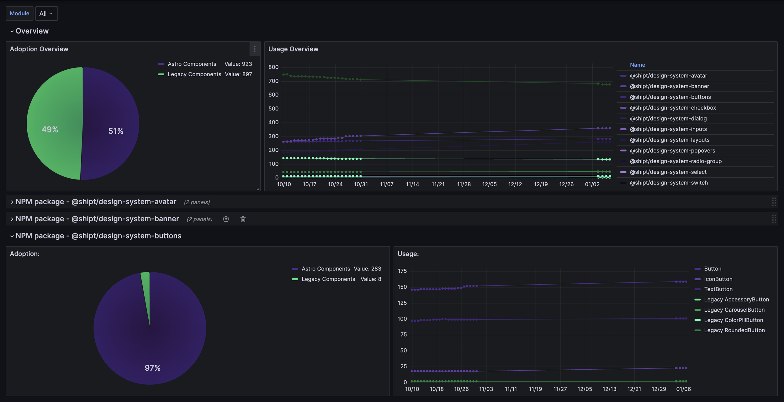 As Astro started to get into code libraries and support multiple teams, we need more. What matters is what the end user is interacting with and that means code. To gain insights, our engineers wrote a script that checks Github repositories every night for the teams that we support. This gives us visibility into how adoption is going, if we are going to make changes who needs to be informed, and helps provide data to inform OKRs that we can articulate back to our stakeholders.