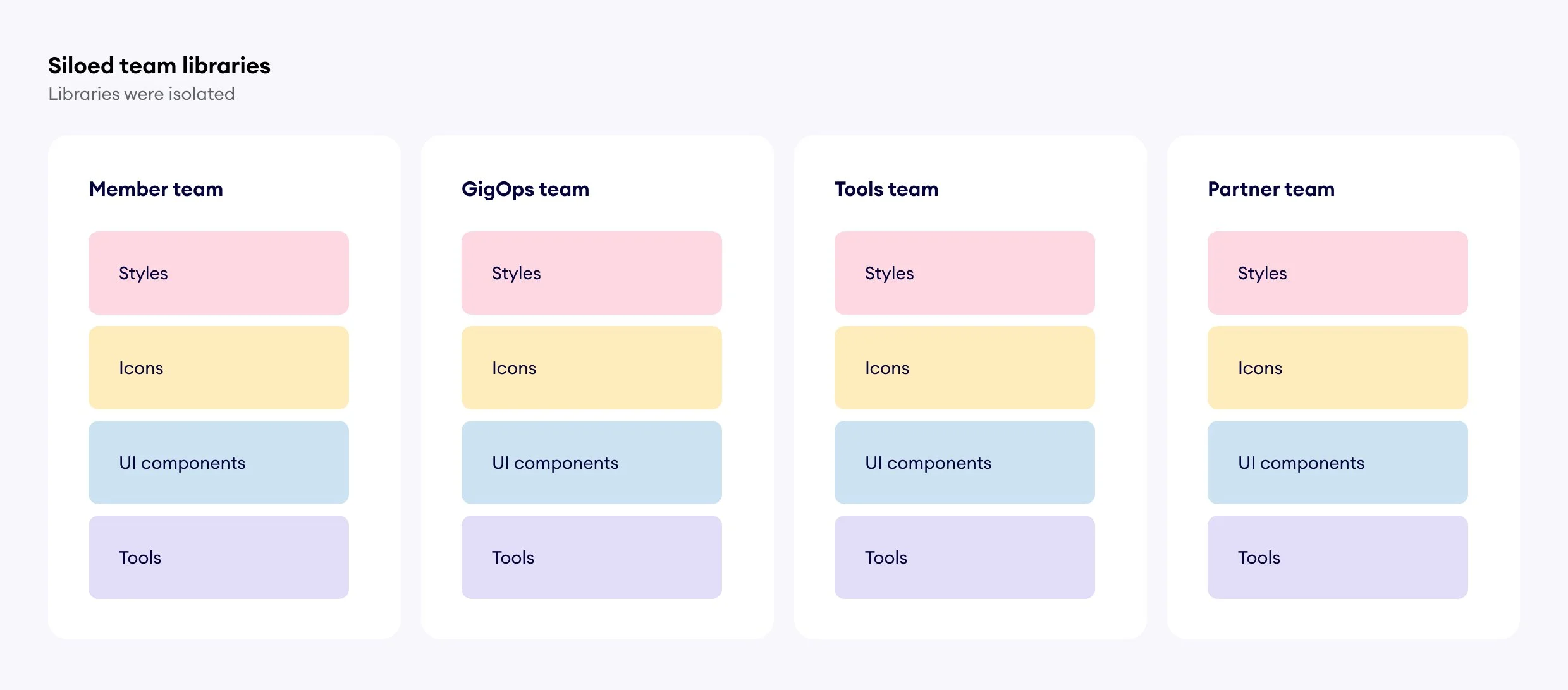 Before Astro was created, each product had their team’s libraries housed in separate team spaces. This led to each team trying to solve the same problems with different executions and little cross pollination.