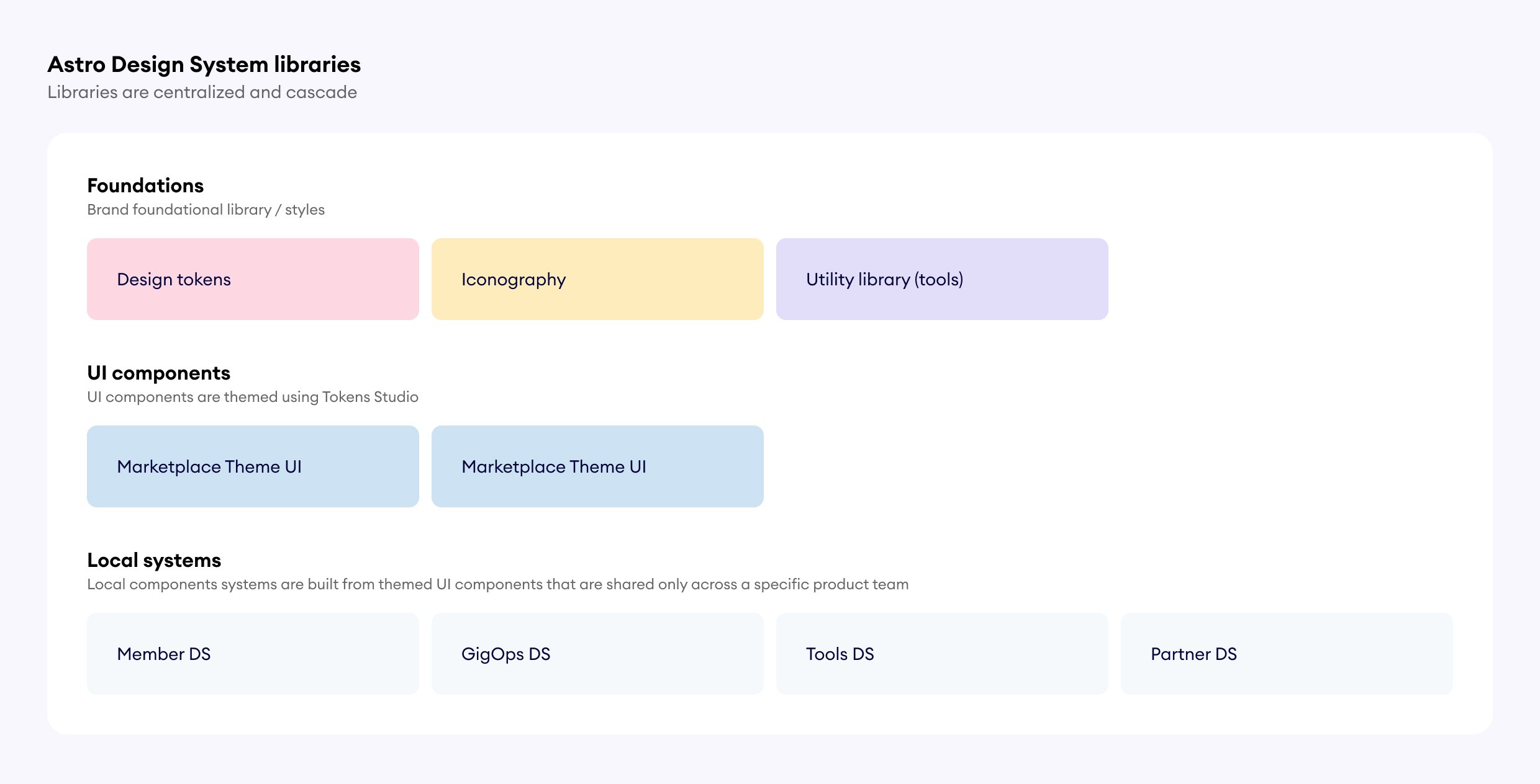 Astro introduced a new way of working that breaks up the toolset to cascade from high level atomic elements that are shared across the entire organization to very specific / complex components that are leveraged across one team. This allows teams to still create bespoke and specific things, but centralized them to increase visibility into what other teams are doing.