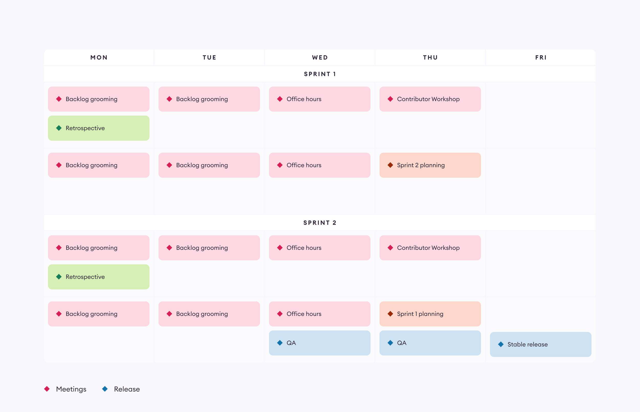 Holistic efforts like design systems require a constant push and pull of input and feedback with the teams that we support. To make that happen, we have a series of recurring rituals that are inclusive to our core team, contributors, and the larger organization. This allows us to tailor an agenda and get appropriate feedback from stakeholders.