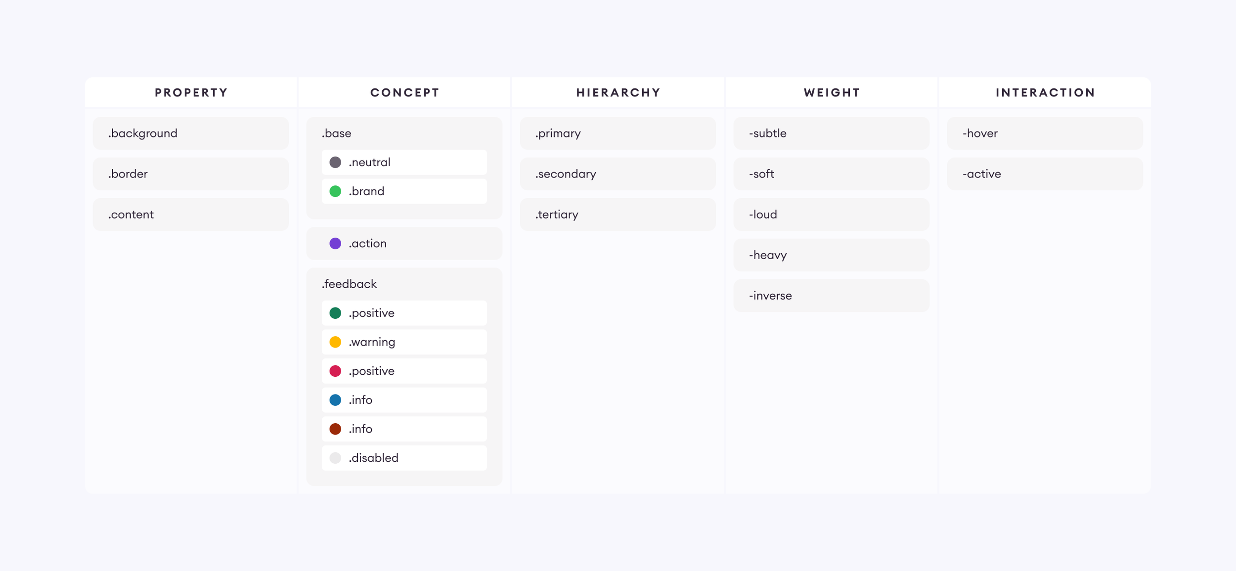Myself and an engineer worked closely to develop our semantic design token structure from scratch. We started the process leveraging Nathan Curtis - “Naming Tokens in Design Systems”. While this was a good starting point, names got very long and cumbersome so we simplified them. With the introduction of Figma Variables’ constraints, we made a few tweaks to make it easier to apply them by making the property category first.
