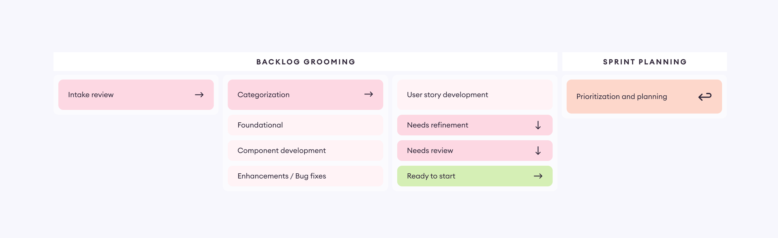 Astro design system's process is an evolving practice that is co-designed with design and engineering. Our process was created by observing how we make things and continual optimization through retrospectives and workshops with stakeholders. We embed that process into our operational and planning tools through templates and documentation that is visible by everyone. This ensures that we are following a consistent process and allows us to share steps of that process with others who would like to contribute.