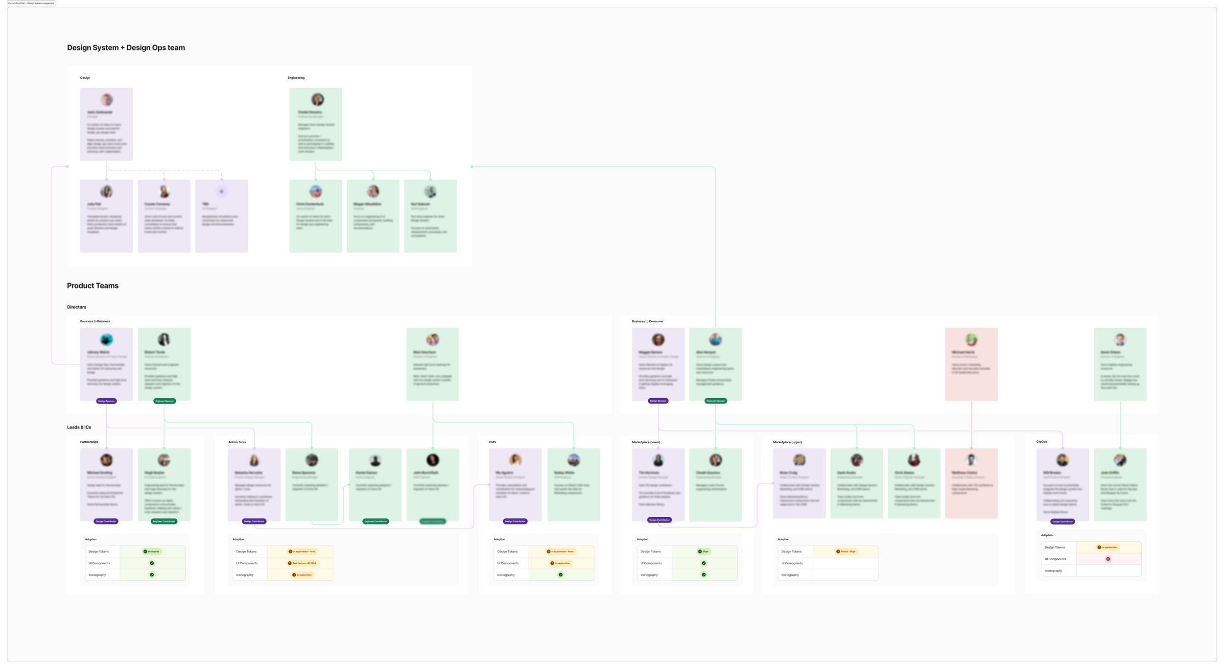 Part of design systems is the cultural changes that need to happen and how to get people behind it from both a grass roots and director level. We do that by gaining sponsors at the director level, and by creating a small group of contributors who are actively helping provide the context that the system needs and the hands to get our tasks done at times. To make our progress clear as we communicate to stakeholders, I created an org status chart.