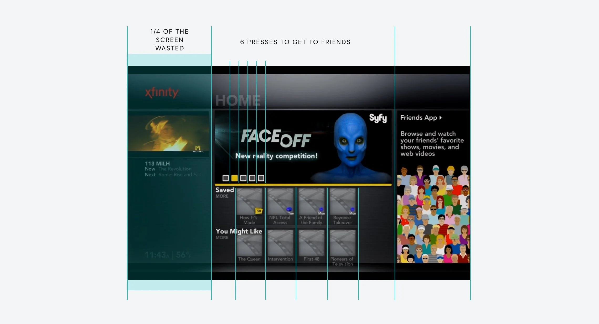 Comcast had spent a year and half developing technology to enable its next generation TV experience. While the technology was promising, the user experience was performing poorly in market trials. With executive pressure to start scaling X1 out to customers, I was given the opportunity to lead a team to redesign Comcast's first benchmark UI.
