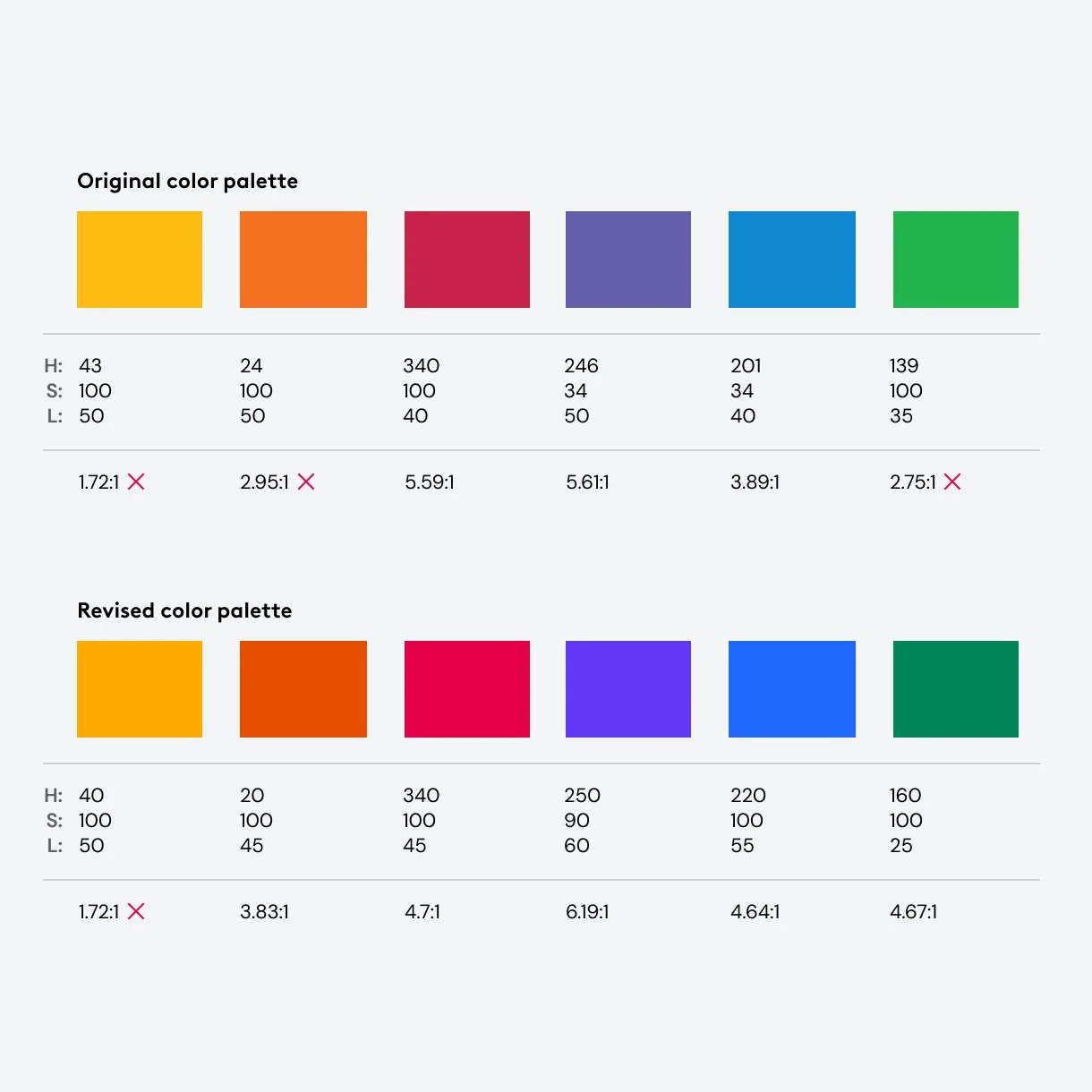 I knew the majority of our experience was going to be in light situations. In our study, many of the Comcast colors did not pass contrast requirements. This was an opportunity to refine the colors so that they were more balanced, digitally stunning, and contrast compliant. For final decisions, I used a minimum of 3:1 against white, which we were able to do except for yellow. To help ensure that contrast compliance is met, there is additional documentation for how to use yellow and 4.5:1 requirements.